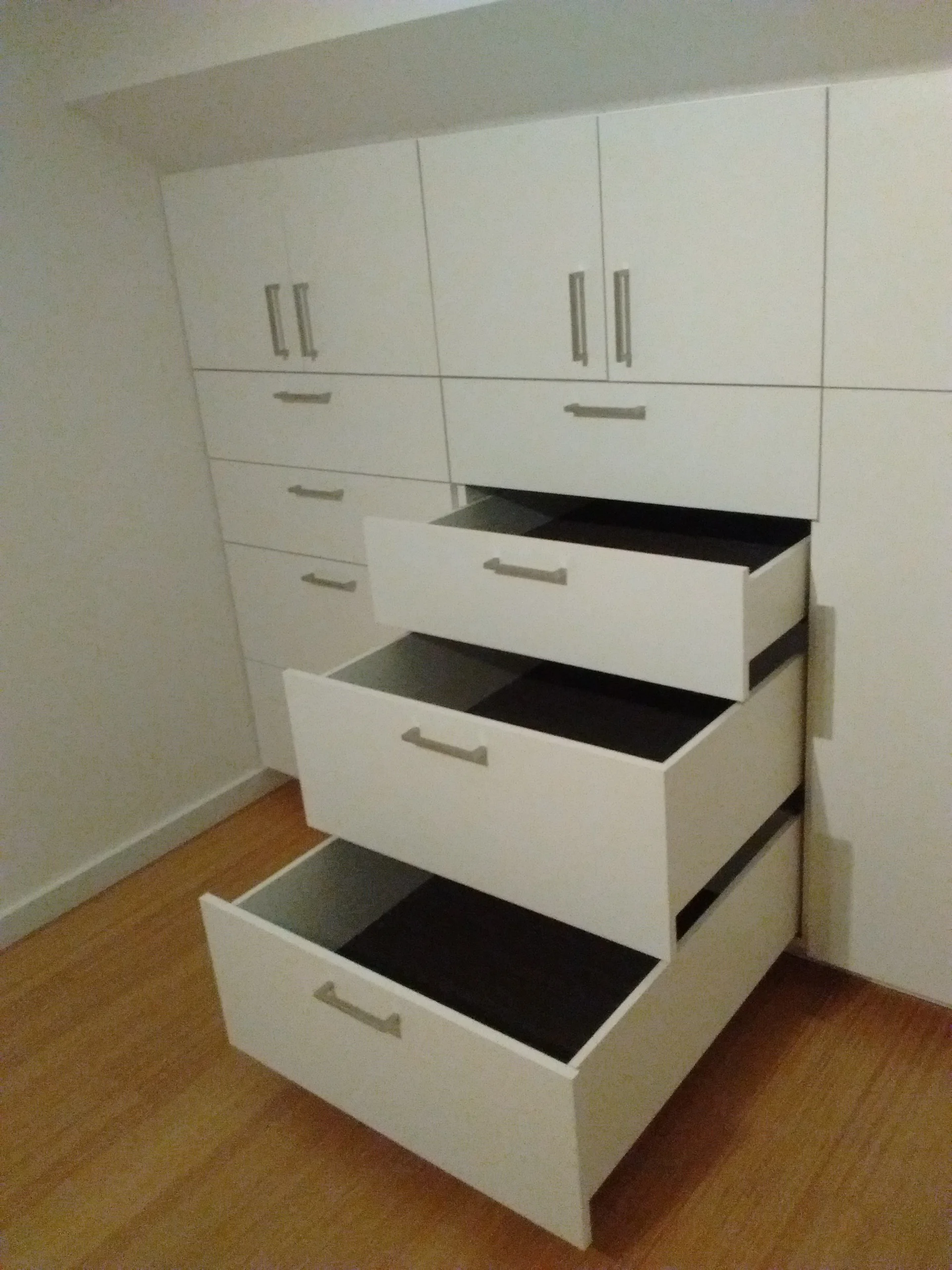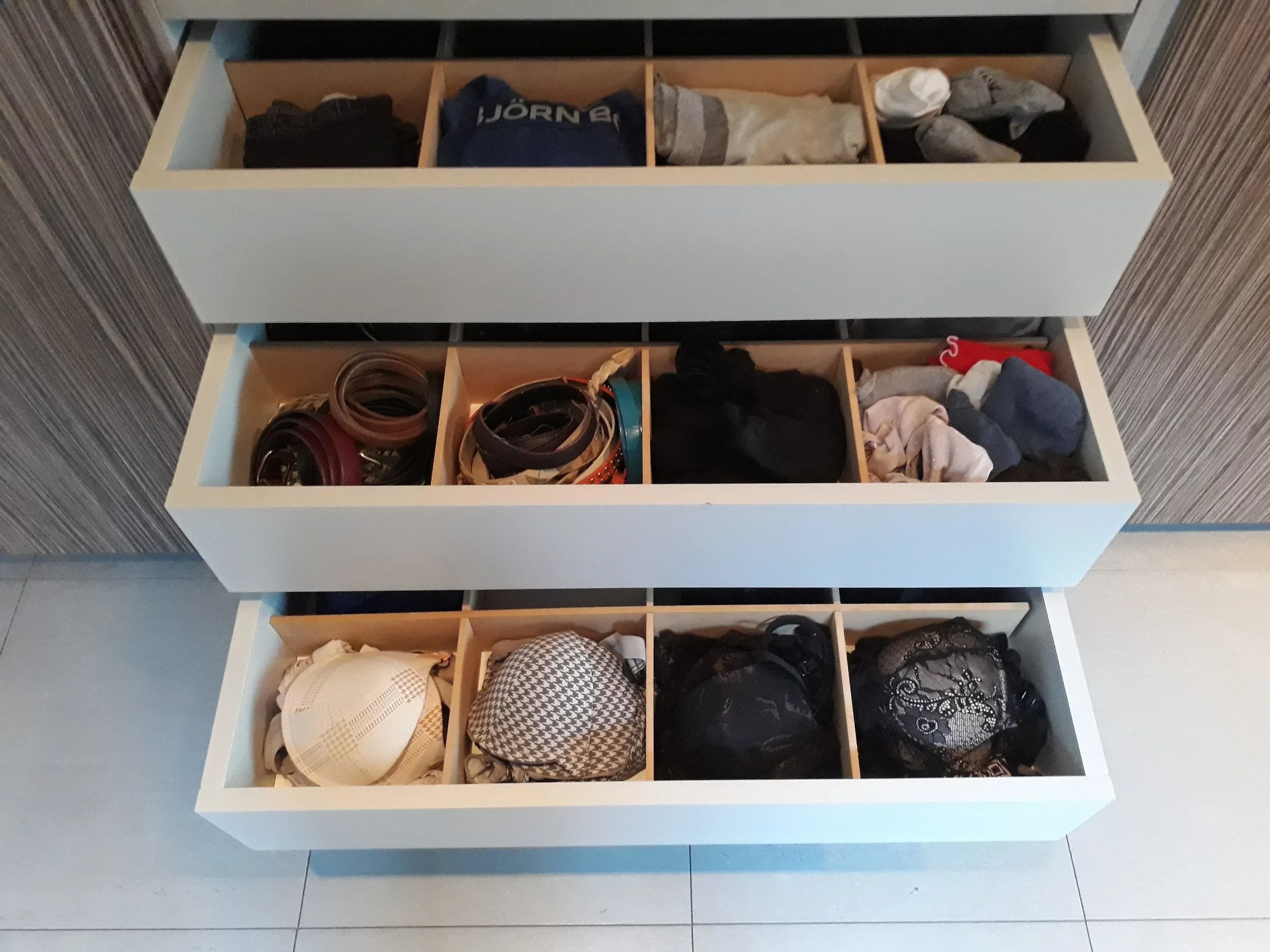 Achter de kast zit een schuine wand waardoor onderaan zeer veel plaats is. Deze wordt bijna volledig benut door zeer diepe schuiven die gevuld zijn met enkele tientallen paren schoenen.
