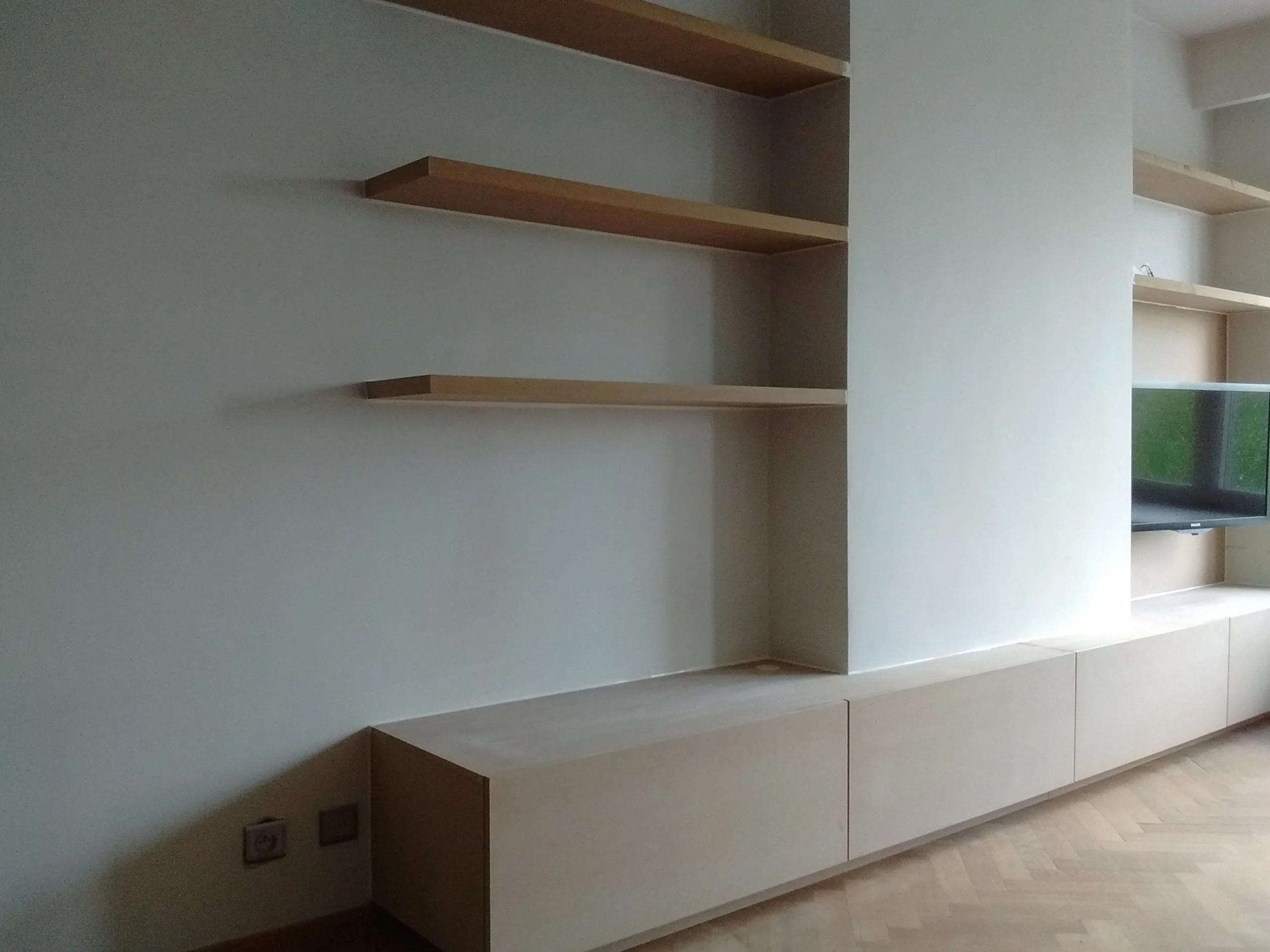 Dit meubel werd later door de klant zelf wit gelakt. Alle kabels voor de TV werden weggewerkt in een valse wand waaraan de TV hangt. Andere TV apparatuur zitten in de kast en kunnen bediend worden zonder de kasten te openen. Geen digicorders of Playstations die in het zicht moeten staan. Er werd ook een LED-strook voorzien in de plint die eveneens met een afstandsbediening geregeld kan worden.