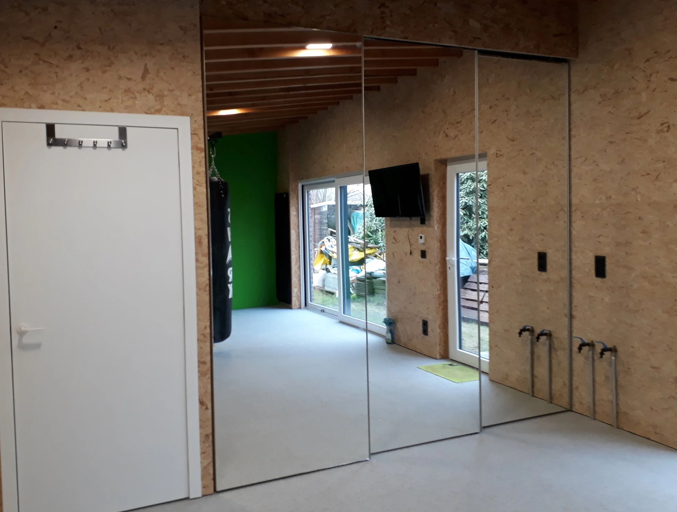 Deze ‘zware’ opdracht creëert een spiegelwand van bijna 3m breed en 2,6m hoog. Deze 3 grote deuren zijn redelijk zwaar maar zijn verankerd in een sterke houten draagbalk en zijn gemakkelijk te verschuiven dankzij een rolsysteem dat 80kg per deur aankan.