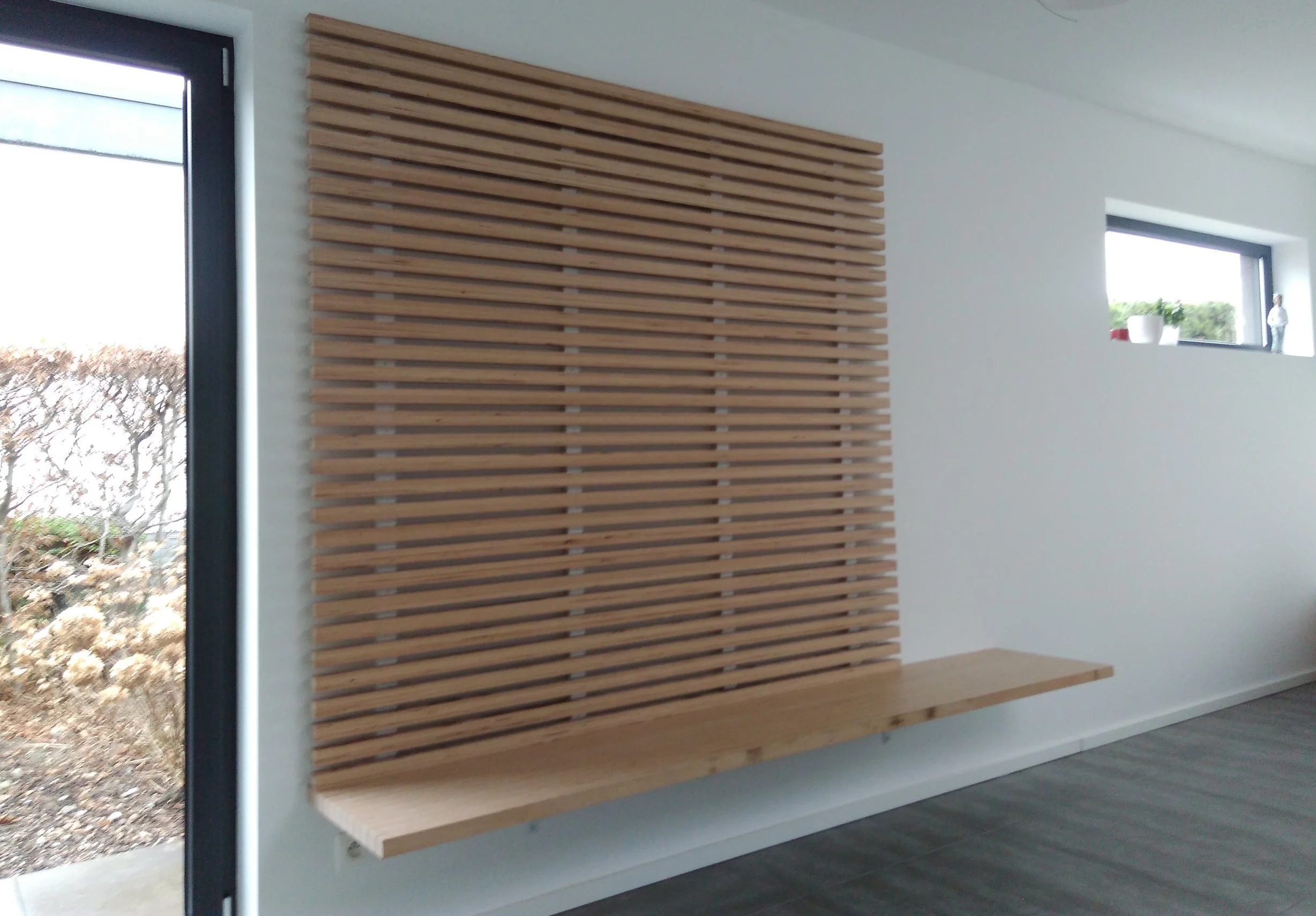 Het idee van de achterwand kwam van de klant zelf. De spatie tussen de latjes is danig gekozen dat er eventueel houten schapjes tussen geplaatst kunnen worden voor decoratie of planten.