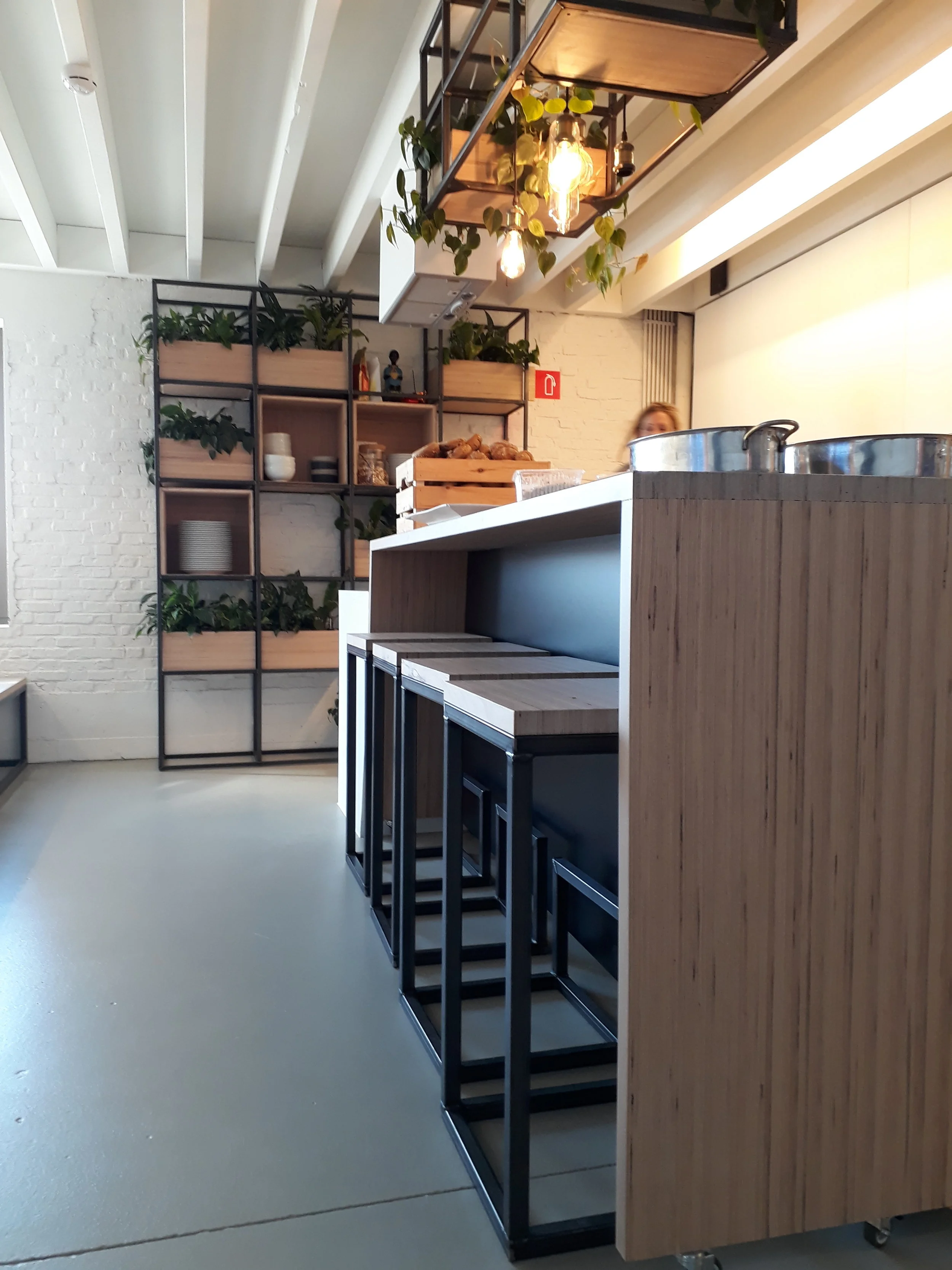 met stalen krukjes. In de achtergrond een metalen rek gevuld met houten bakjes of leggers. Er is veel mogelijk dankzij het mooie werk van mijn lasser.